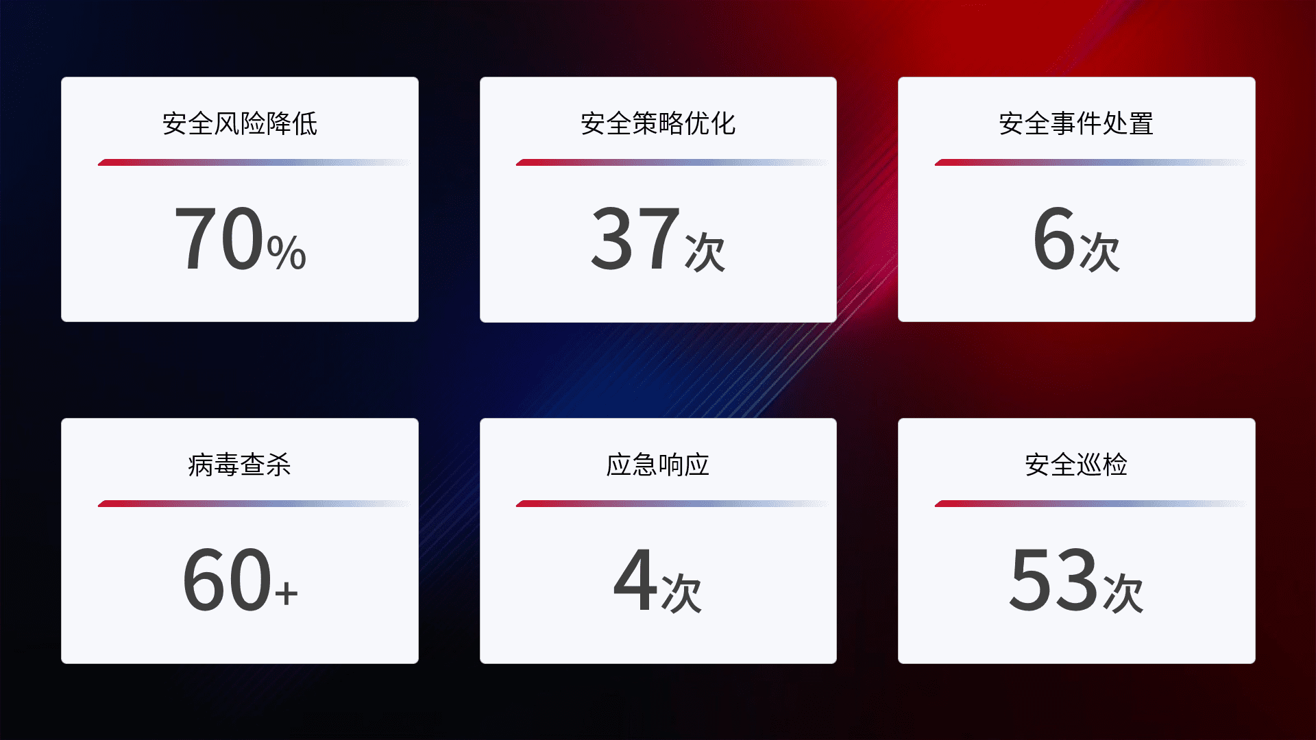 提供全面的安全事件报告体系,,包括处置报告、、周报、、季度和年度总结,,结合持续监控,,,帮助客户深入了解网络安全状况。。